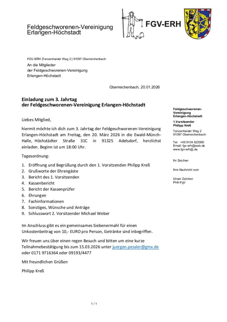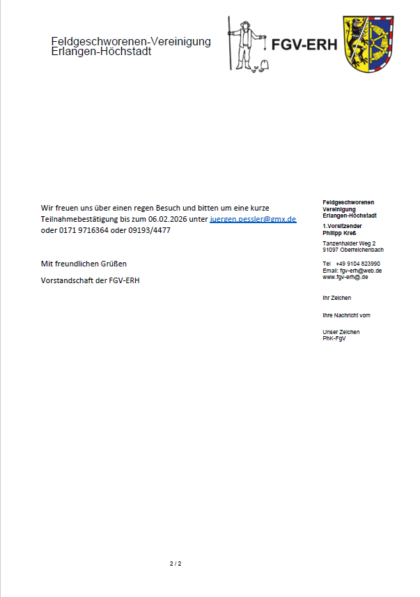 jeder vereidigte Feldgeschworene im Landkreis Erlangen-Höchstadt ist eingeladen, der Vereinigung beizutreten und von der Gemeinschaft und den Angeboten zu profitieren! Einfach die ausgefüllte Betrittserklärung per Mail an fgv-erh@web.de senden. Der Mitgliedsbeitrag beträgt 15 € pro Jahr und wird in den meisten Fällen von deiner Heimatgemeinde gespendet. Bei Fragen wende dich an: fgv-erh@web.de.